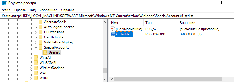 В этом разделе создадим новый параметр DWORD (32 бита) и задаем ему имя такое же, как имя пользователя, котрого хотим скрыть. В моем случае я его обзываю kif_hidden: